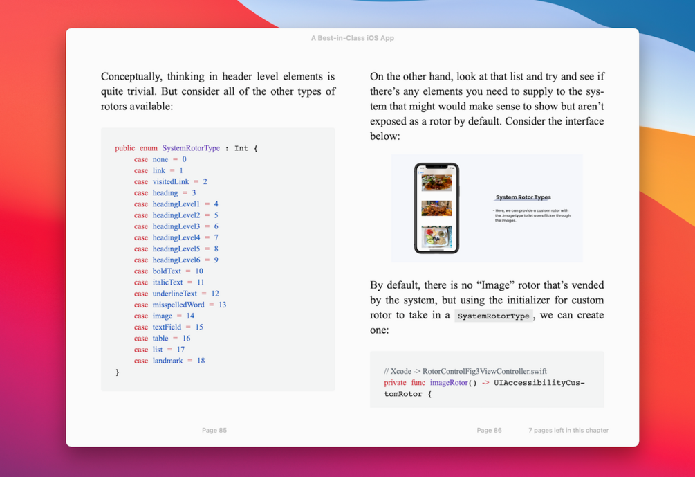 The book series in .pdf and .epub formats. Xcode code sample project. Discord server access. Free updates going forward.